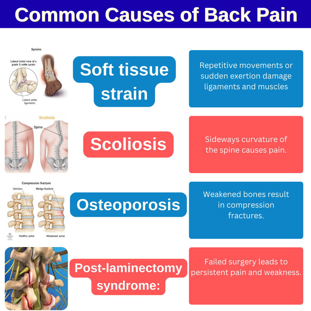 Soft tissue strain :- काम या खेल के दौरान बार-बार होने वाली गतिविधियाँ, या अचानक से होने वाला ऐसा परिश्रम जिसके कारण पीठ में खिंचाव आ जाता है, रीढ़ की हड्डी के स्नायुबंधन या पीठ को सहारा देने वाली मांसपेशियों में खिंचाव या क्षति पहुंचा सकता है। Scoliosis :- रीढ़ की एक जन्मजात विकृति जिसमें रीढ़ की हड्डी बगल की ओर मुड़ जाती है। आगे चलकर, यह स्थिति पीठ दर्द के रूप में प्रकट होती है। Osteoporosis :- एक बीमारी जो समय के साथ हड्डियों की संरचना और मज़बूती में बदलाव के कारण विकसित होती है। हड्डियों का यह क्षरण और कमज़ोरी अंततः रीढ़ की हड्डी में संपीड़न फ्रैक्चर का कारण बन सकती है। Post-laminectomy syndrome :- पीठ की सर्जरी विफल होने से पीठ में लगातार या अधिक दर्द, कमजोरी, सुन्नता और/या झुनझुनी हो सकती है, और यहां तक कि रीढ़ की हड्डी में रक्त प्रवाह भी बाधित हो सकता है।
