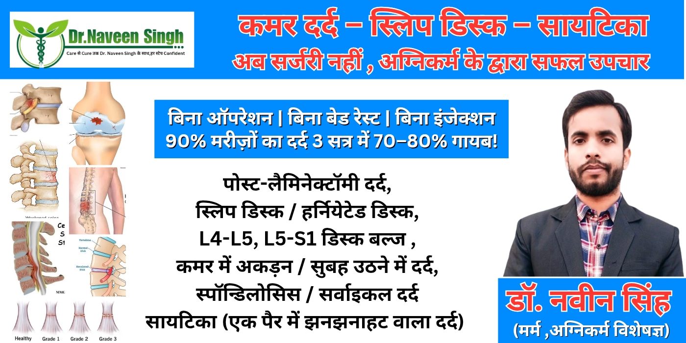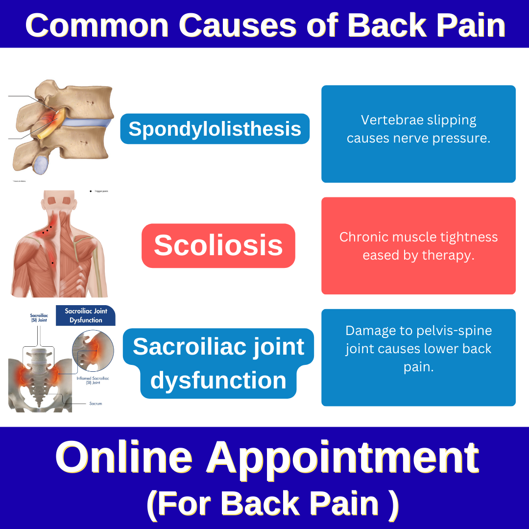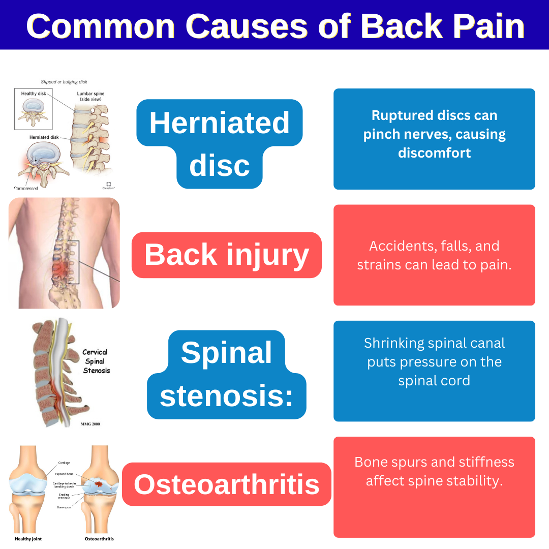 Herniated disc :- कशेरुका हड्डियों को अलग करने वाली डिस्क क्षति या उम्र बढ़ने के कारण फट सकती है, जिससे नरम कोर बाहर निकल जाता है और तंत्रिका दब जाती है, जिसके परिणामस्वरूप असुविधा होती है। Back injury :- दुर्घटनाएं, गिरना, अत्यधिक परिश्रम और खेल संबंधी तनाव पीठ की चोटों के सामान्य कारण हैं। Spinal stenosis:- इस दर्दनाक स्थिति में, रीढ़ की हड्डी की नली सिकुड़ जाती है, जिससे रीढ़ की हड्डी दब जाती है और रीढ़ की हड्डी पर दर्दनाक दबाव बनता है। Osteoarthritis :- यह वृद्ध लोगों में होने वाली एक आम समस्या है, जिसमें रीढ़ की हड्डी में हड्डी के उभार विकसित हो जाते हैं और स्थिरता खो जाती है, साथ ही कठोरता, सूजन और लचीलेपन में कमी आ जाती है।