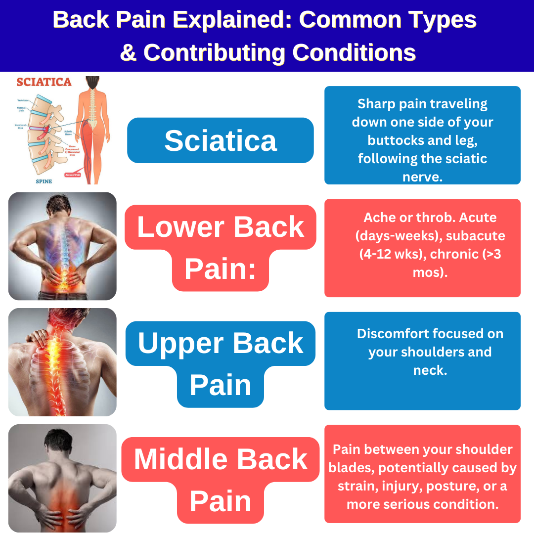 Sciatica:-दर्द के संकेतों की वि शेषता यह है कि ये दर्द पी ठ से शुरू हो कर नितंबों से हो ते हुए जांघ तक साइटिक तंत्रिका के मार्ग पर चलते हैं। इस प्रकार का दर्द आमतौर पर शरीर के केवल एक ही हिस्से को प्रभावित करता है। lower back pain:-अचानक, तेज़ दर्द या लगातार, स्थायी दर्द के रूप में प्रकट हो ना । तीव्र कमर दर्द आमतौर पर कुछ दिनों से लेकर एक महीने तक रहता है, जबकि उप-ती व्र दर्द 4 से 12 हफ़्तों तक रहता है। पुराना दर्द तीन महीने से ज़्यादा समय तक बना रहता है, और लगभग पाँच में से एक तीव्र दर्द का मामला पुरा ने दर्द में बदल जा ता है। Upper back pain:- इस क्षेत्र में समस्याएँ पीठ के निचले हिस्से की तुलना में कम आम हैं, लेकिन उतनी ही असुविधाजनक भी । यह आमतौर पर कंधों और गर्दन पर केंद्रित होती है। Middle back pain:- वक्षीय रीढ़ की हड्डी से जुड़ी समस्या ओं के कारण होने वाला , मध्य-पीठ दर्द कई समस्याओं का संकेत हो सकता है, जैसे कि खिंचाव, चोट, या खराब मुद्रा । कभी -कभी यह किसी अधिक गंभीर अंतर्निहित स्थिति का भी संकेत हो सकता है। इसलिए, किसी भी पीठ दर्द की व्यापक जांच के लिए किसी विशेषज्ञ से जांच करवाना ज़रूरी है।